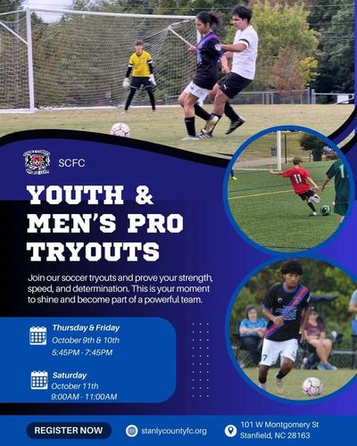 Are you ready to take your game to the next level? Stanly County FC is holding open tryouts for both our Youth Travel Program and our Semi-Pro Team. Check out the details below — we hope to see you there!